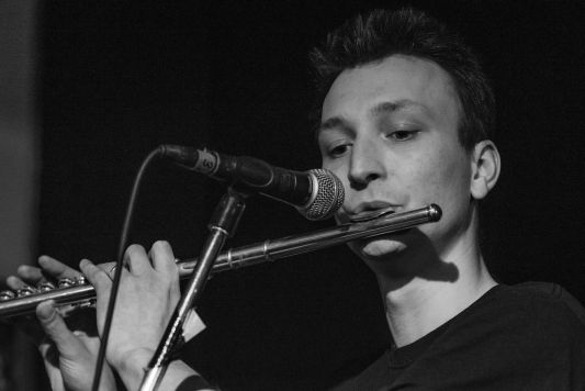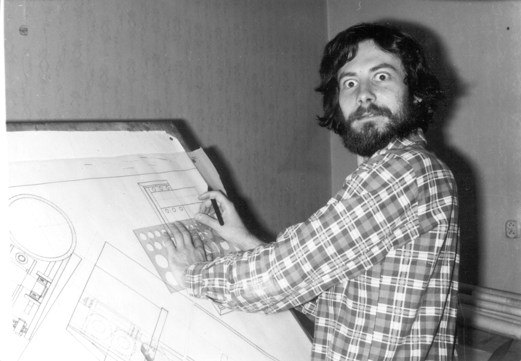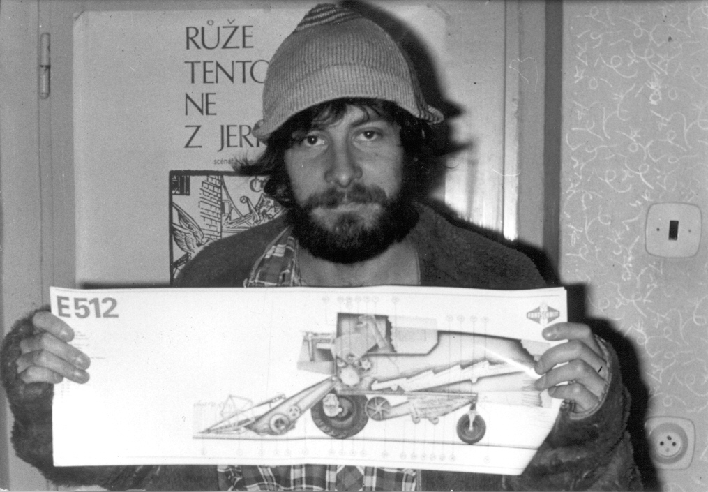Here pictured with a leaflet of the machine E512 Fortschritt (originally his own idea) which Veverka got from his East German friends. When Veverka found out his idea was stolen he got astounded. "Now I go shepherding" he said and left to get the job in the mountains. There he learned to play the Slovak sheperds long pipe and some other whistles and pipes. It was a lot of years later that he unified the techniques of playing on long pipe and flute reaching the quite similar quality of sound which is typical of the recordings by his most beloved band Jethro Tull. (1985) |