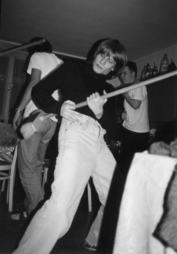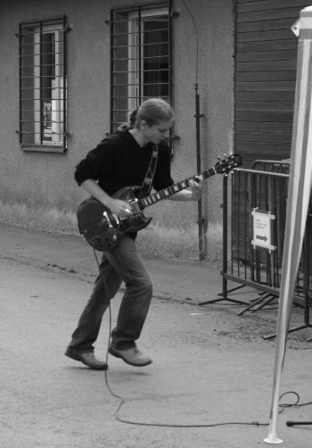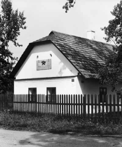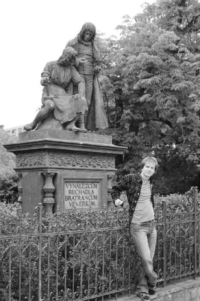 Marty Veverka před rodným domem Václava Veverky, zde vyfotografován unikátní daguerrotypickou metodou "Jára da Cimrman's back to back fotostep". |