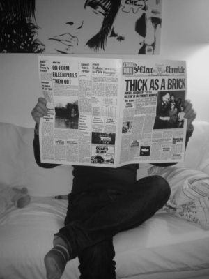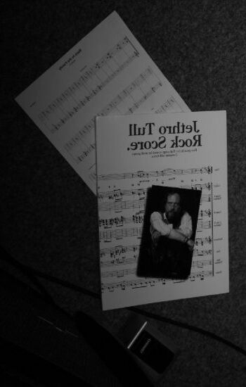 Veverky, jak studuje repliku slavného historického notového partu, který napsal sir Jethro Tull,