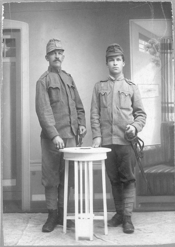 | A jedna z mála fotografií na těchto stránkách, u které můžeme s naprosto klidným svědomím konstatovat, že historická fakta na ní zachycená rozhodně nejdou, a to tak, že v žádném případě, nijak zpochybnit, a za tím si opravdu stojíme, je tato poslední - je na ní zachycen děd a praděd jistého Davida a Roberta Pytlíka v okamžiku, kdy v roce 1915 rukovali do C. K. armády. Snímek byl pořízen ve Skutči, těsně před jejich odchodem na frontu. (1915) |