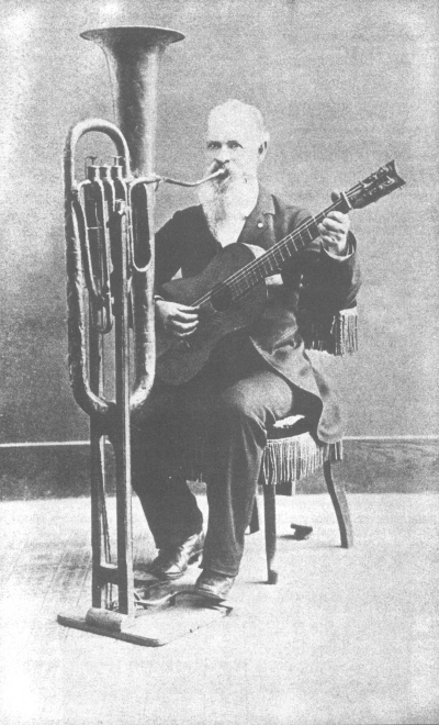 Close to his death Vaclav Veverka renders the commemorative anthem "Locomotive Breath". His cousin Frantisek, who plays the double-bass and a variety of percussion instruments of the period, wasn´t taken in the picture unfortunately. (1849) |