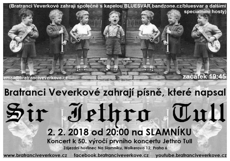 Bratranci Veverkové děkují všem, kdo jste dorazili v pátek 2. února 2018 na Slamník. Byli jste úžasní, před takhle narvaným sálem jsme opravdu ještě nikdy nehráli, tak díky moc za skvělou atmosféru. Slavili jsme tam jednak 50. výročí prvního koncertu Jethro Tull a jednak de facto i naše 13. narozeniny (narozeniny slavíváme, když na to tak přijde, kdykoli od srpna, kdy se zárodek kapely dal dohromady - do června, kdy jsme měli první veřejné vystoupení), takže jsme rádi, že jste dorazili v tak hojném počtu - a že se tak díky vám ta oslava 50. výročí prvního vystoupení naší i vaší oblíbené kapely (vystoupili 2.2.1968 v Marquee clubu v Londýně, ten den prvně pod jménem JETHRO TULL) tak výborně vydařila.