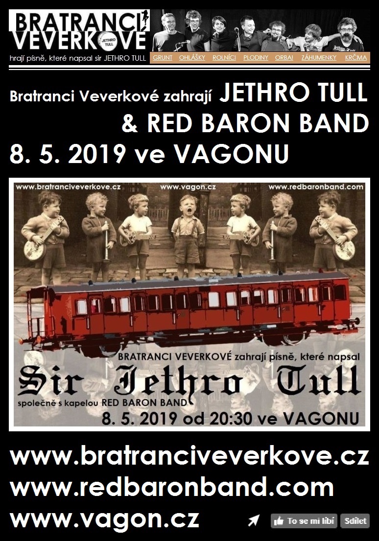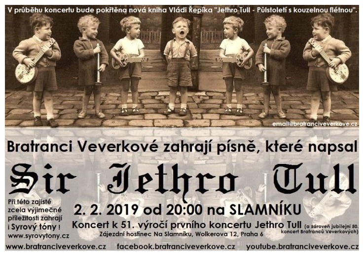 Děkujeme všem, kdo jste přišli v sobotu 2. února 2019, na Slamník - mysleli jsme si, že loňský Slamník jen tak nic nepřekoná, ale mýlili jsme se - tento letošní koncert, který se konal u příležitosti prvního výročí oslavy padesátého výročí prvního koncertu Jethro Tull - a zároveň to bylo naše kulaté padesáté veřejné vystoupení, byl snad ještě úžasnější než ten loňský - tak díky všem, kdo jste se na té skvělé atmosféře svou přítomností podíleli. A všichni, kdo jste na Slamníku ať už byli nebo nebyli - a chcete si naživo poslechnout jak zpíval mladý Ian Anderson na počátku 70. let, přijďte na našeho nového a věřme že i definitivního zpěváka bratrance Barneyho Veverku s veverčí "big bandovou" kapelou za zády znovu - zahrajeme s ním tentokrát 8. května 2019 ve VAGONU. A společně s námi tam vystoupí i věhlasná hard-rocková kapela RED BARON BAND, kterou zajisté nemusíme rockovým fanouškům nijak dlouze představovat. Tak doražte, těšíme se opět na vás!