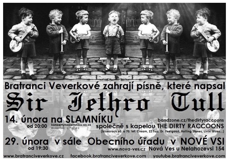 Jo a nezapomeňte, kdo jste tak dosud neučinili, se ještě podívat na březnovou "novinku" o kousek níž - místo hlášky "Zatím to zde není - ať můžete ještě nějakou dobu tipovat správnou odpověď..." tam totiž už teď fakt visí řešení toho tehdejšího kvízu. Výherci, panu Miroslavovi, ještě jednou gratulujeme - do Vagonu mu to tenkrát v květnu nevyšlo, tak se těšíme na viděnou v únoru na SLAMNÍKU - a to nejen s ním, ale i se všemi fanoušky jethrotullí (Bratranci Veverkové hrají Jethro Tull, to jsme teda jako my) a bluesrockové (THE DIRTY RACCOONS hrají bluesrock 60. a 70. let: Cream, ZZ Top, Dr.Feelgood, Rolling Stones, Livin'Blues...) klasiky! Konec zcela vyčerpávajícího hlášení!