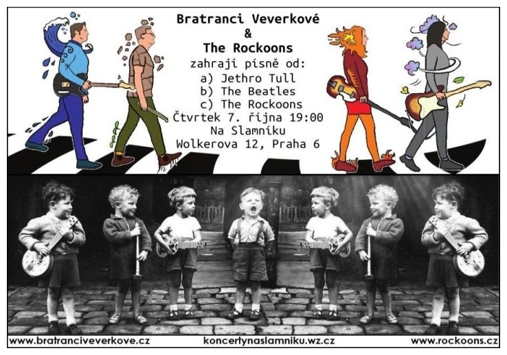"Situace je nadmíru výtečná." Tuto větu pronesl dva roky po jistém miléniu jistý pan primátor, zvaný též Ignor, jistého hlavního města jisté malé středoevropské země - a to zrovna v tom jistém okamžiku, kdy do podzemní dráhy v tomto městě začaly pronikat první kapky tisícileté vody. Naše webovky jste si ale mnoho let po této povodni při brouzdání na internetu pro detailní studium (čemuž nasvědčuje i to, že čtete tyto řádky) zajisté nezvolili proto, abychom i my vám zde lhali. Kultura v naší zemi, potažmo celá "naše země nevzkvétá. Velký tvůrčí a duchovní potenciál našich národů není smysluplně využit", dovolujeme si zde uvést ještě jeden citát, tentokrát, a to i po mnoha letech, mnohem trefnější a pohříchu i aktuálnější. A co hůř - na Slamníku kvůli té všeobecně známé lapálii nezahrajeme ani toho 15. května, jak jsme zde již dříve v lednové ohlášce avizovali... Tak zkusme nadhodit ještě jeden termín... BRATRANCI VEVERKOVÉ zahrají společně s kapelou THE ROCKOONS na SLAMNÍKU ve čtvrtek 7. října 2021. Teď nebo nikdy! Tedy ne teď, ale toho 7. října! Ale hlavně nikdy neříkej nikdy... Ale pořád se něco děje... Např. o tom, že ani v této těžké době náš mistr hluboké orby Plech jakož i naše kapelní bonga nezahálejí, když on-line přenosem živého hraní nehazardují s životy svými a svých blízkých, se můžete přesvědčit třeba TADY (jpg). Anebo trochu obsáhleji i ZDE první a TADY druhá část celého záznamu (Youtube). (A náš kapelní Youtube je ZDE, klikejte tam, koukejte, poslouchejte, odebírejte, lajkujte a všechny ty věci, které se tam dají dělat, dělejte.) A hlavně nezapomeňte: Tak tedy v říjnu i s našimi bongy na viděnou na Slamníku!
