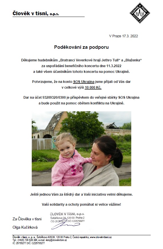Díky moc všem kdo jste se 11. března 2022 zúčastnili koncertu na Slamníku a přispěli tím na pomoc Ukrajině (resp. v jednom případě nezúčastnili a přesto přispěli) - po zaplacení pronájmu sálu a místního zvukaře nám v kasičce zbylo 9745,- Kč - takže jsme Člověku v tísni na SOS Ukrajina (číslo účtu 0093209320/0300) poslali rovných deset tisíc.